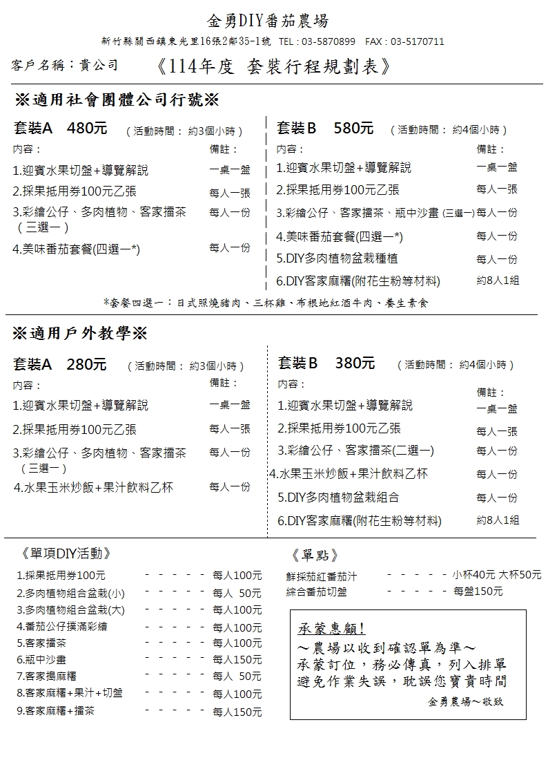 套裝行程適合社會團體公司行號 *為必填欄位。 A套裝.B套裝 活動內容 ※此套裝行程適用於25人以上團體 請填寫基本資料 姓名* 性別 男 女 電話* 傳真 EMAIL 聯絡時間* 至 備註 驗證碼* 送出資料